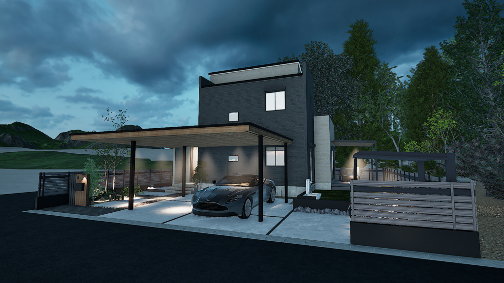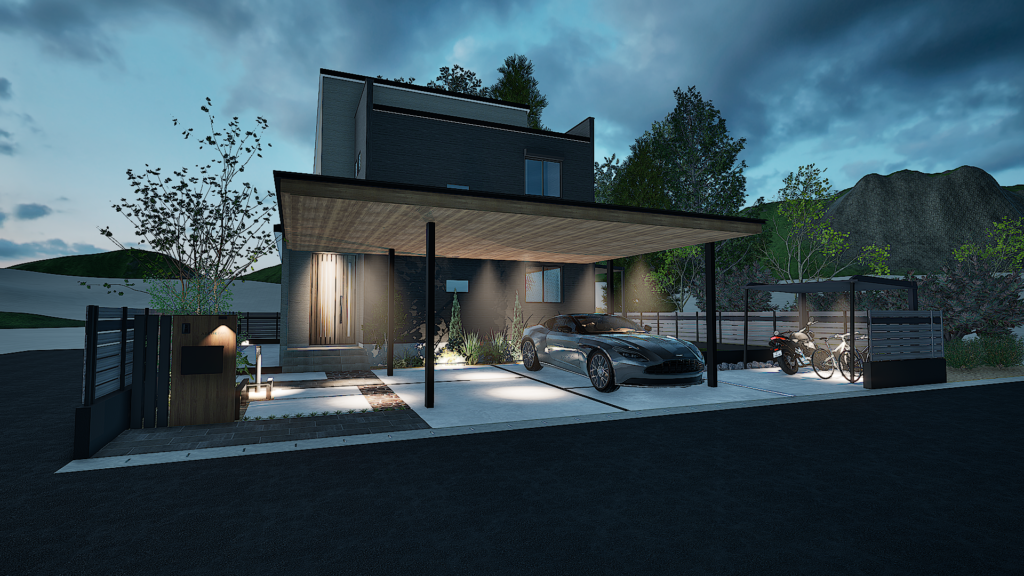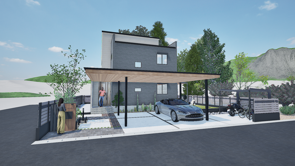 駐車場から玄関まで屋根が続いているため、雨天の場合でも濡れづらい配置でのプランです