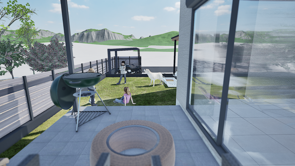 お庭はご家族が色々な場面で使用できるようにタイルデッキや人工芝で演出しました